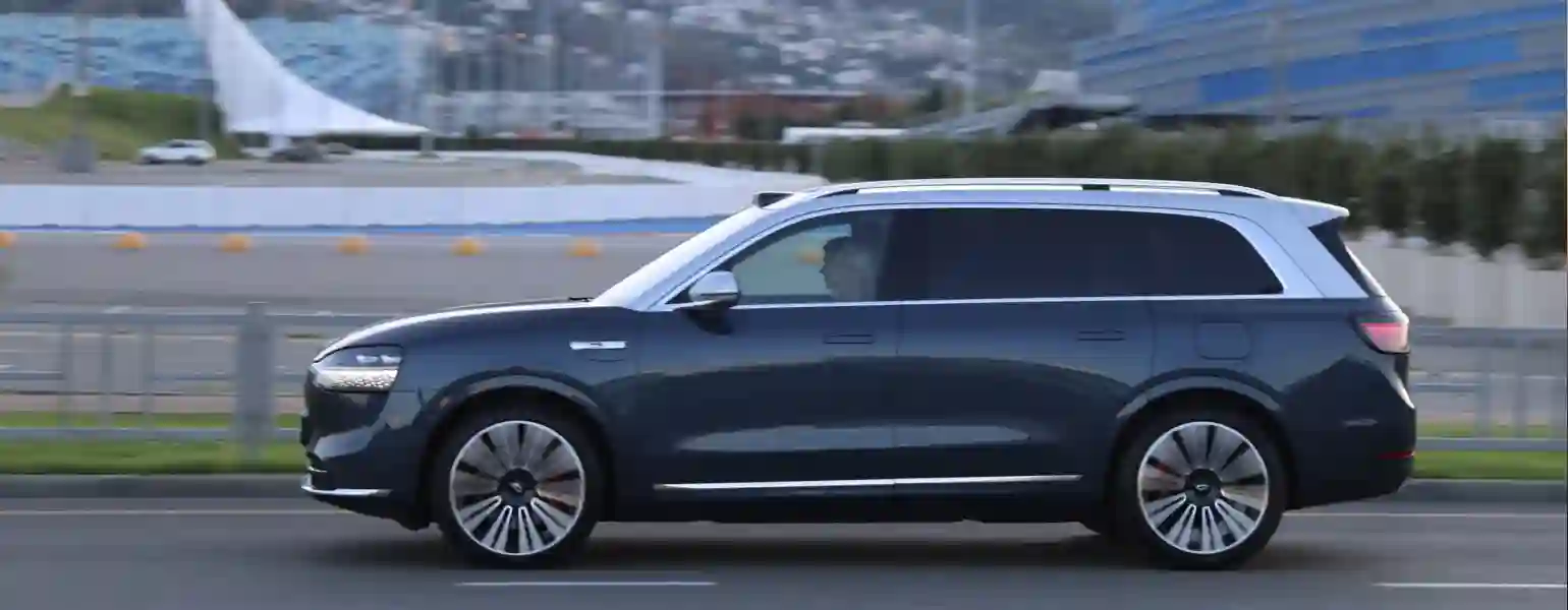 Полноразмерный (габариты, д/ш/в – 5230/1999/1800 мм) кроссовер AITO SERES М9 оснащен последовательно-гибридной силовой установкой: бензиновый двигатель (152 л. с.) используется для подзарядки тяговой батареи с запасом энергии 42 или 52 кВт•ч. В городе М9 может передвигаться в режиме 100% электромобиля, бензиновый двигатель подключается для длительных поездок за городом. Мощность силовой установки – 496 л. с., крутящий момент – 675 Н•м, разгон автомобиля до 100 км/ч – 4,9 с. Запас хода на полной зарядке батареи и полном баке превышает 1300 км (по стандарту CLTC). Автомобиль имеет внушительный и величественный, но при этом плавный и элегантный дизайн. Тщательно проработанная аэродинамика большого кроссовера обеспечила ему беспрецедентно низкий для этого класса коэффициент аэродинамического сопротивления Cd – всего 0,279. Автомобиль оснащен интеллектуальной системой полного привода. Подвеска М9 – пневматическая, c адаптивной регулировкой жесткости и возможностью регулировки дорожного просвета в диапазоне 80 мм (до 225 мм). В комбинации с лидаром подвеска может заранее подстраиваться под профиль дороги. Для снижения веса автомобиля в конструкции кузова и ходовой части в значительной степени используются детали из алюминия.