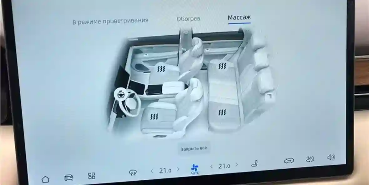 Припоминаю, так же было и в тестовом GLS. На заднем ряду – тоже подогревы, вентиляция и массаж, а для управления климатом у задних пассажиров есть своя панель в обращенном к ним торце центральной консоли. Специальными кнопками можно уронить вперед спинку кресла переднего пассажира и сдвинуть вперед подушку, но это, скорее, для версии с раздельными креслами второго ряда, которые можно превратить в полноценный шезлонг, а у нас пятиместный SERES M7 со сплошным диваном на заднем ряду. Места здесь много, даже для троих – средняя часть дивана плоская. Но наклон спинки дивана не регулируется.